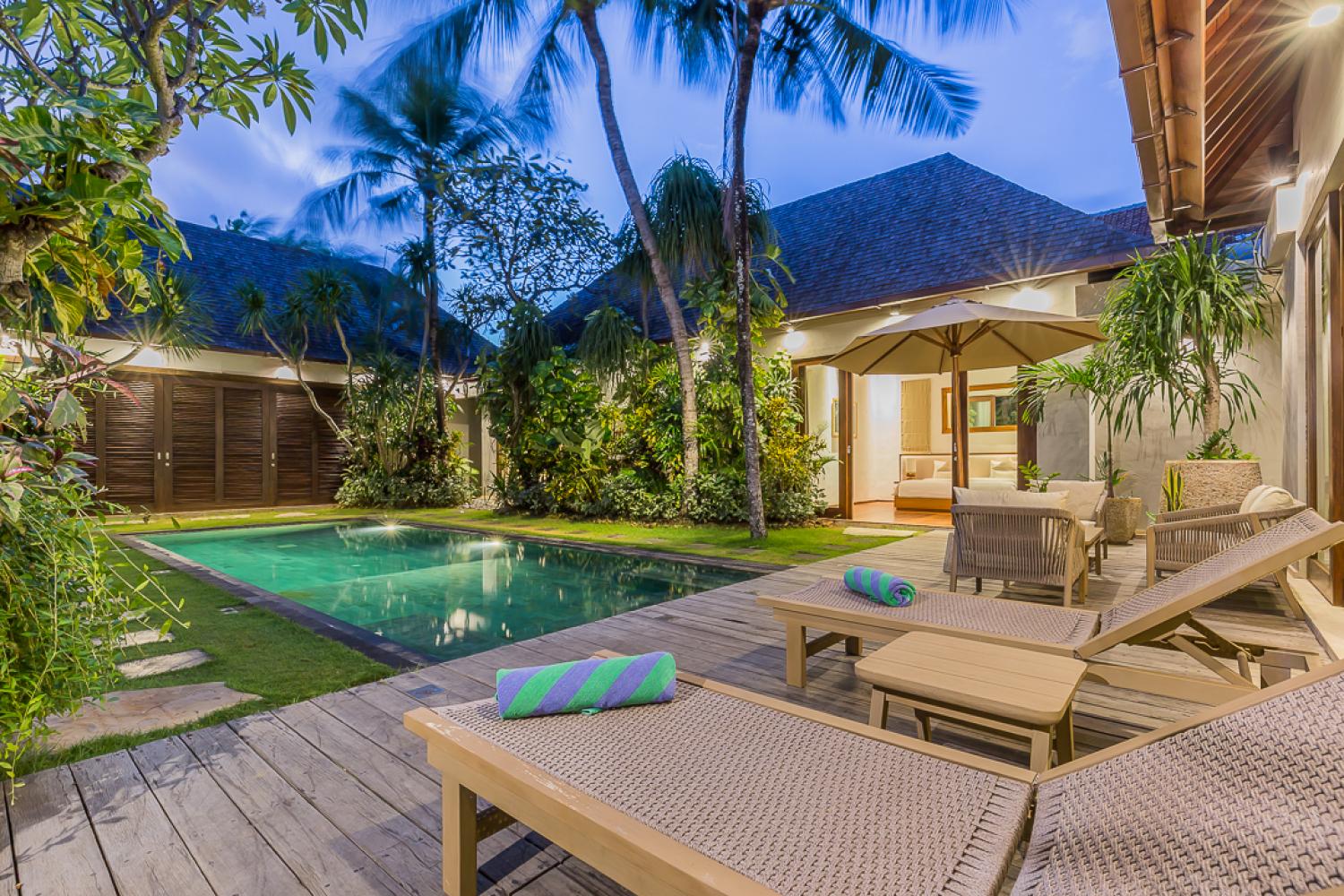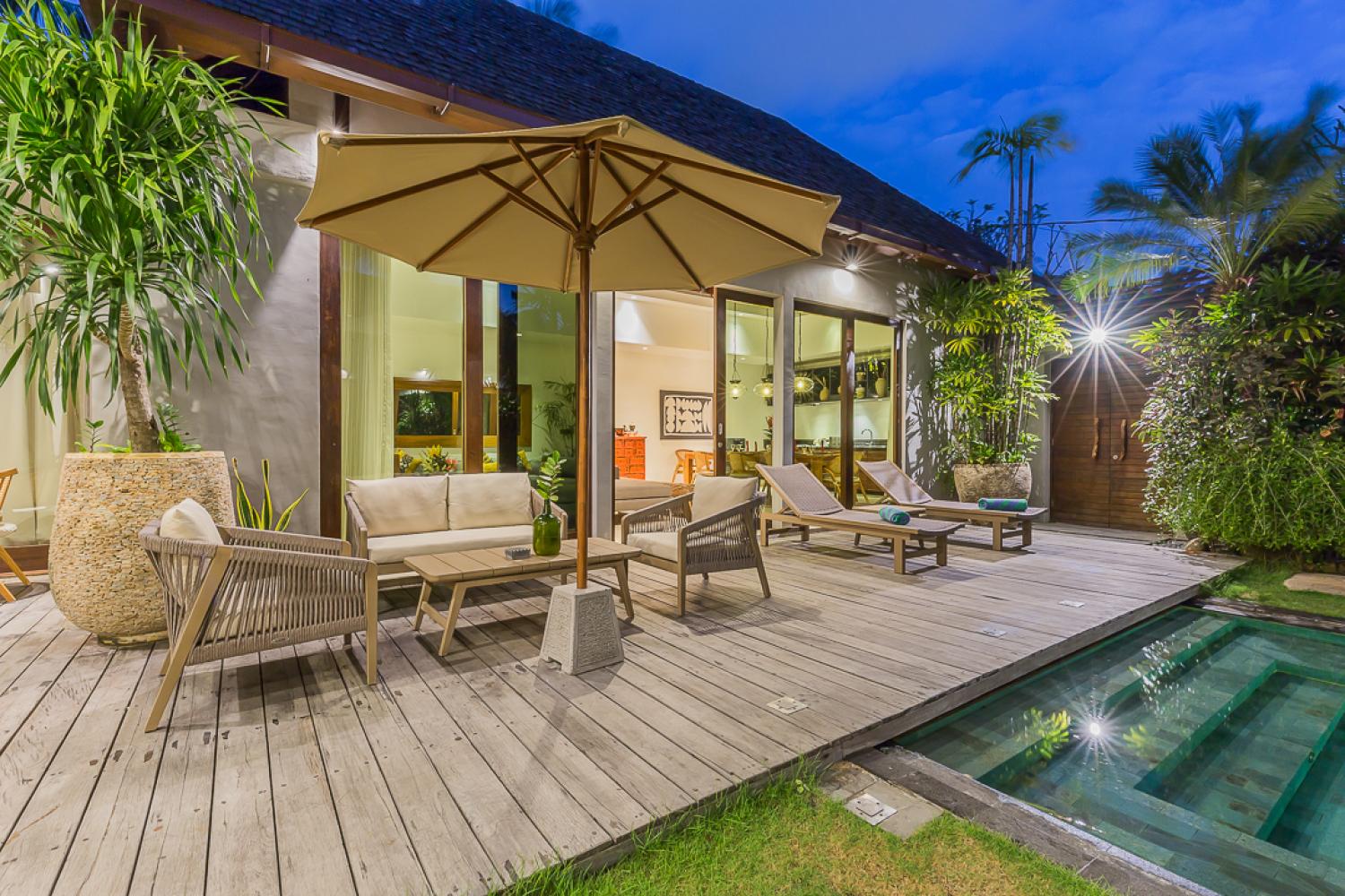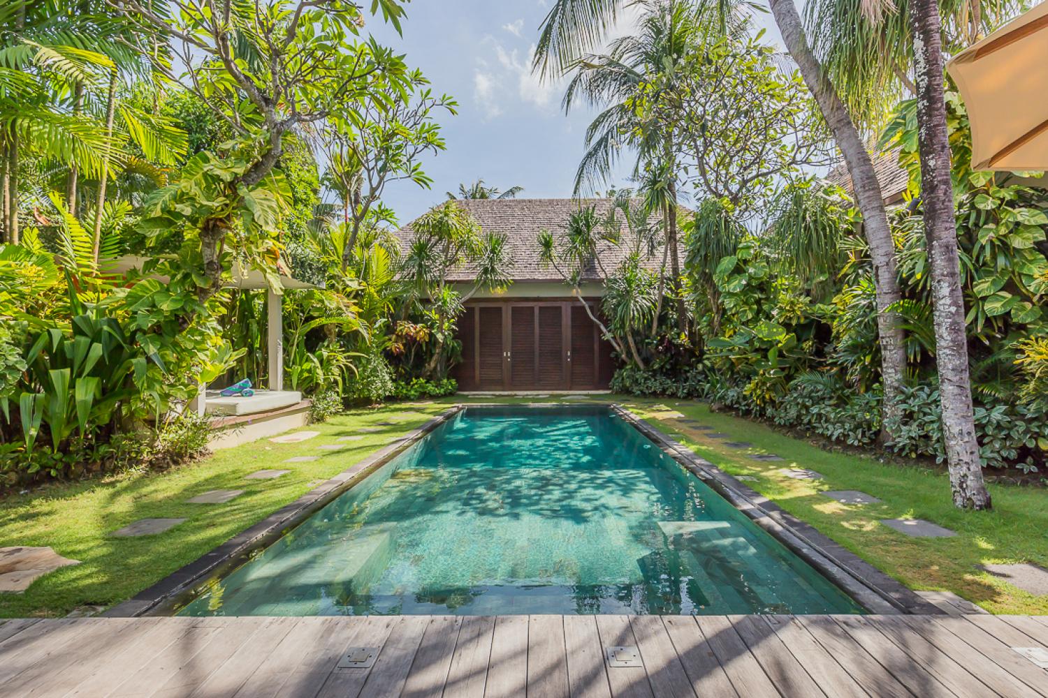 A beautiful green outdoor area with pool, wooden deck and sun loungers is ready for you to enjoy your day in the sun or shade! The outdoor lounge area is perfect to come together, play games or have a little afternoon snack. You will love the quiet ambience and the beautiful garden in the middle of bustling Seminyak, just steps away from popular beach clubs, shops and restaurants.