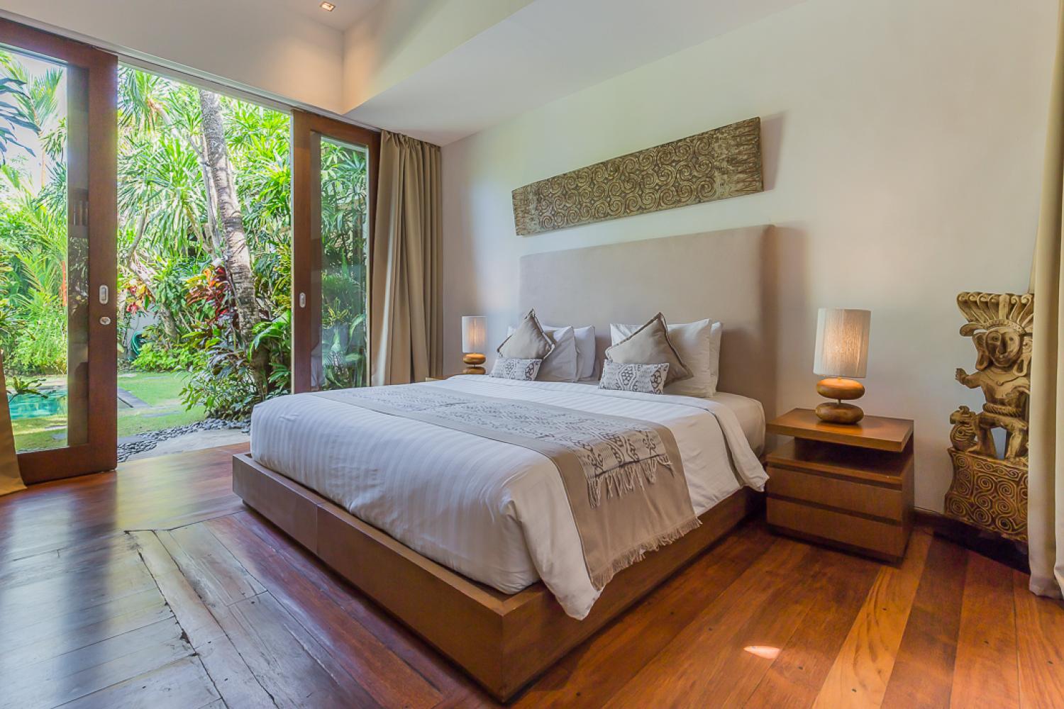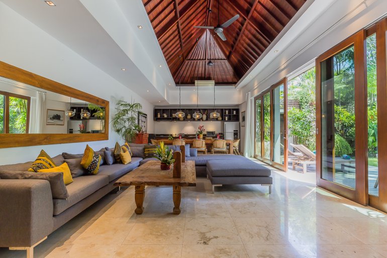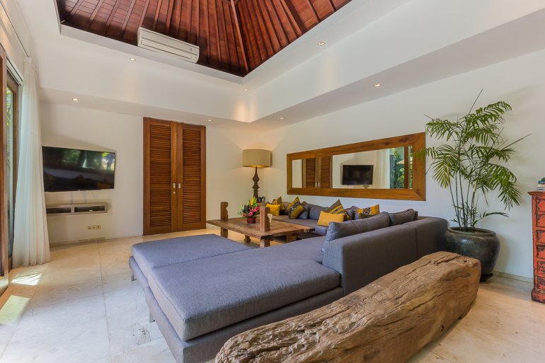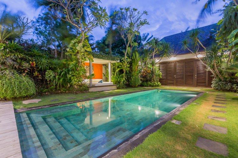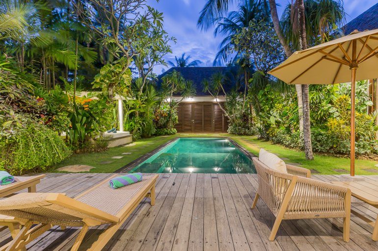A beautiful green outdoor area with pool, wooden deck and sun loungers is ready for you to enjoy your day in the sun or shade! The outdoor lounge area is perfect to come together, play games or have a little afternoon snack. You will love the quiet ambience and the beautiful garden in the middle of bustling Seminyak, just steps away from popular beach clubs, shops and restaurants.